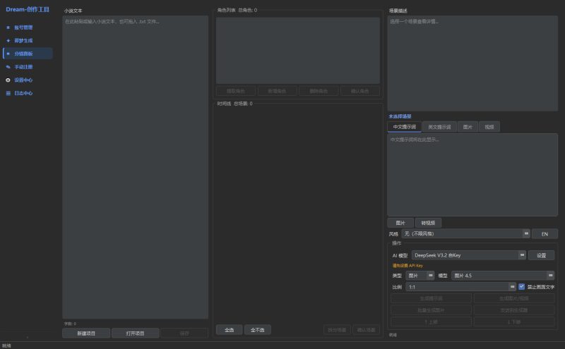 1.0.6版本增加了分镜/AI功能,支持最新deepeek 3.2,请到deep seek官方神奇apikey充值10元可以使用很久。