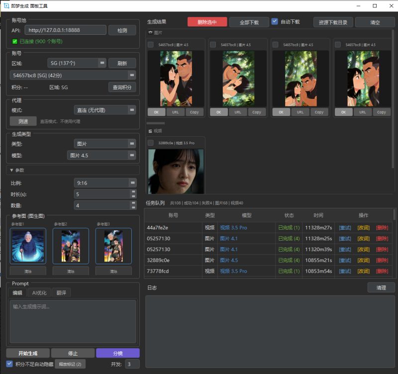主要功能是[账号池]与[即梦生成]面板接口服务,需要先开启[API服务],勾选即可,也有第三方接口,如果你懂得对接即可本地调用来对接第三方工具来获取账号池的账号,不懂就直接开启[即梦生成]。