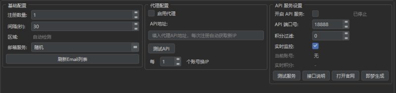 注册数量,按需设置不要一次性生成全部,个人建议生成50个账号使用,不够在生成,间隔5-10秒,