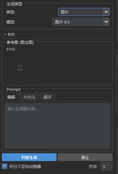 选择你的模型,填写提示词,点击开始生成,积分会实时更新·积分不够主动切换账号3次未找到足够积分请点击重试。