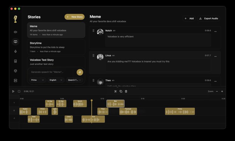 Voicebox 是一款本地优先的语音克隆工作室,具备类似 DAW 的功能,可用于专业语音合成。