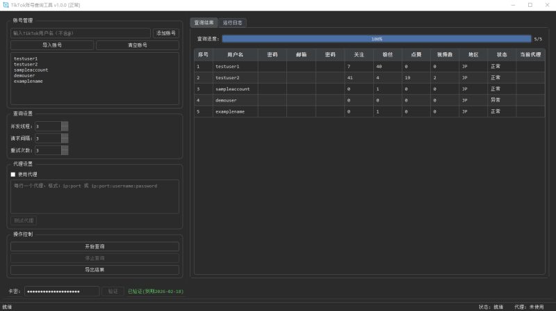 高效便捷的TikTok账号批量检测工具,助您快速评估账号存活率及详细信息。