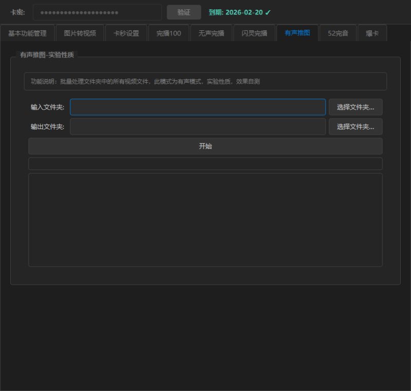 - 批量处理点击“输入文件夹”选择待处理视频所在目录点击“输出文件夹”选择结果保存目录设置处理参数点击“批量处理”按钮