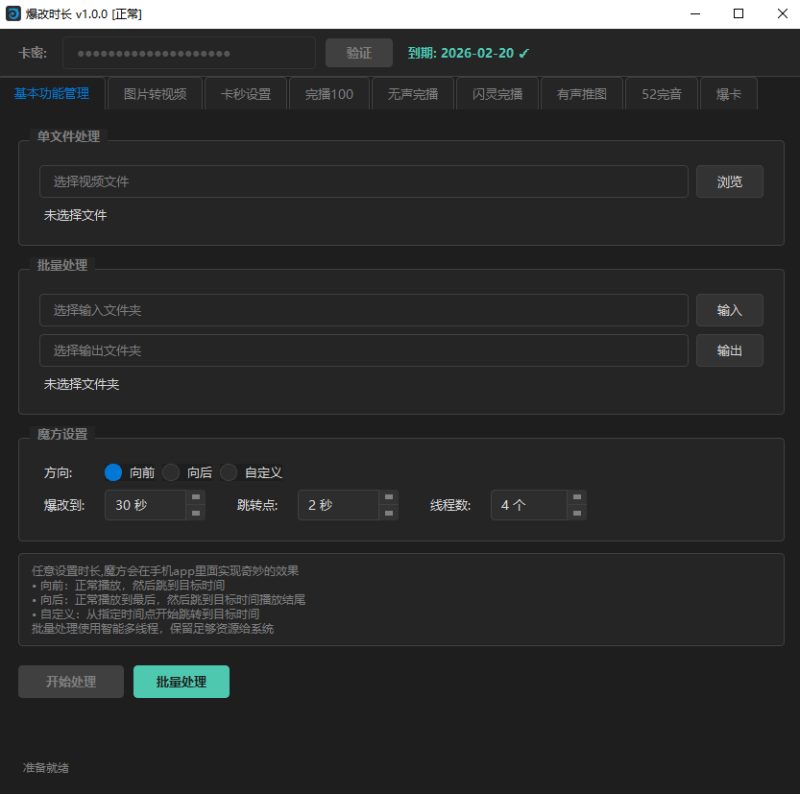 - 单文件处理点击“选择文件”按钮,导入需要处理的视频在“目标时长”栏设置期望显示的时长(5秒-2小时)选择时间跳跃方向点击“开始处理”按钮